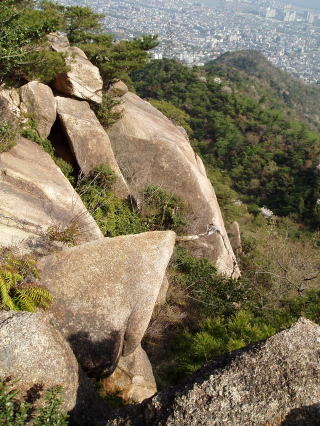 | (8)〜(12) ビックボルダー ビックというだけあって、ボルダー群のなかでも最大の見所だ。 クライミングの課題 8 鯨の頭 2m 9 チムニー 3m 10 くの字のクラック 8m 11 フレークハング 2m 12 爬虫類のカンテ 6m 場所:荒地山の肩の直下にある岩小屋を下ったところにある。ブラックフェースの上方。 |