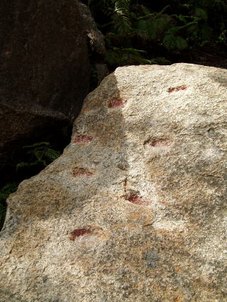 | (23)〜(26) チーズロック 4m 崩壊 課題の多さから推定してこの岩はかなり大きな岩と推定される。 岩が崩れた今となっては、これらの課題も具体的な意味を失った。 クライミングの課題 23 左ハング 24 真中のライン 25 右カンテ 26 スラブのプロブレム 場所:猫の額スラブの下 |