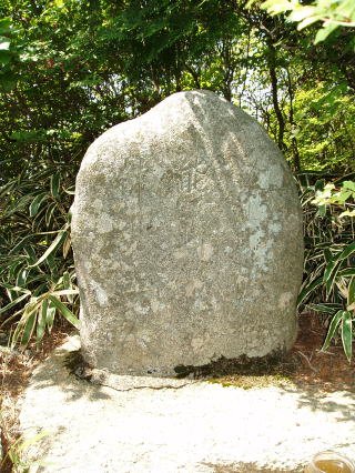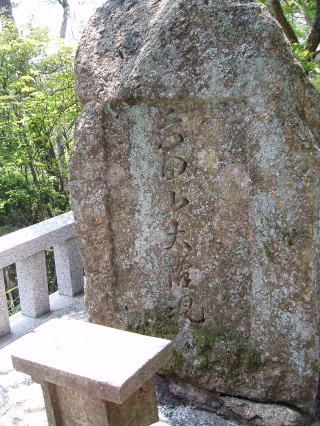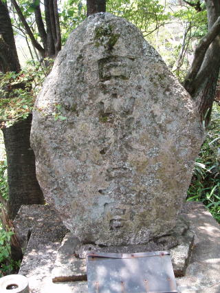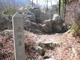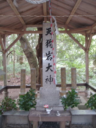 | 天狗岩正面、石丸猿田彦大神の碑が立っている。 二つに割れた陰陽石タイプの磐座である。 |