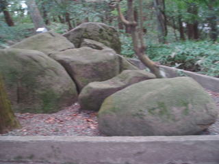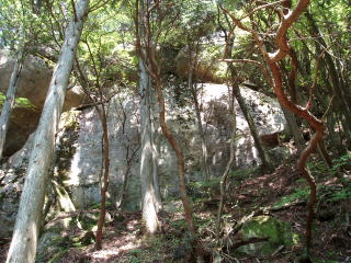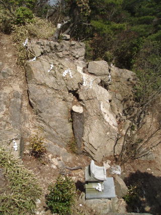 | 社殿側から見下ろした三交岩(三五岩) ここから多数の石鏃が出土した。 |