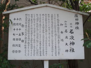 | 名次神社 (広田神社) 名次神社は、広田神社の摂社である。しかし、重要なことは、明治末まで広田神社がこの名次山の位置にあったことである。甲山ー目神山ー名次神社(広田神社)−西宮神社は、南北の方位線上に並んでおり、これを聖なるラインと呼ぶ人もある。 参照サイト 広田神社HP 広田神社 |