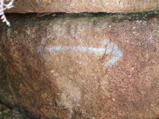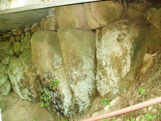 | 七右衛門穴の外壁の石組み | 昔の登山路を示す矢印 | |
