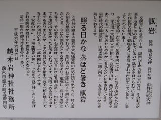 | <伝説> 越木岩神社の案内板より要約 甑岩(こしきいわ)とは、高さ10m、周囲40mの花崗岩の岩で、その形状が酒を作る時の甑に似ていることから名づけられた。古代信仰の霊岩とされ、今を去る約1100年前には、この岩より煙が立ちのぼり、海上を行く船からも見えたと伝承されている。 この神の鎮まる霊岩を大阪城築城のために切り出そうと、村人達の制止の懇願を振り切って、豊臣秀吉が石工に命じて割らせたところ、今にも割れんとする岩の間より、鶏鳴し、真っ白な煙が立ち昇り、その霊気に石工達は、岩もろとも転げ落ち倒れ臥し、如何にしても運び出せなかったと伝えられる。 (注)実際には石の切出しは豊臣秀吉ではなく、徳川氏の大阪城修築(1620年〜1628年)によるものである。甑岩の側面には、池田備中守長幸(備中松山城主)の家紋が刻まれている。 |