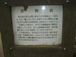 | 天狗岩大神の石碑。最近立てられたものか真新しい | 天狗岩の説明板 | |