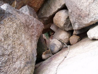 | 登り口から見た岩穴 | 岩穴を抜けたところ、ロープをたらしてある | |
