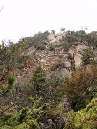 | スタートはここから 黒岩 場所:荒地山の頂上より高座谷に下る道の中ほど左側にある。 松の生えた巨岩が目印 |