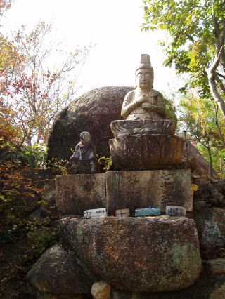 | 第七十一番 弥谷寺 (いやだにじ) この寺は岩窟寺院であり、石仏のメッカである。 岩盤の中に堂宇があり、四国霊場唯一の阿弥陀三尊の鎌倉時代の摩崖仏がある。仏像は、比丘尼谷と呼ばれる崖の面に彫り窪めた舟形光背の中に半肉彫りにされているが、摩滅がひどく、阿弥陀如来の脇持の観音・勢至菩薩は顔がほとんどわからない。 また山内には、八万四千体といわれるの石仏群がある。 本尊:千手観世音菩薩 詠歌 悪人とゆきづれなんも弥谷寺 ただかりそめも良き友ぞ良き |
