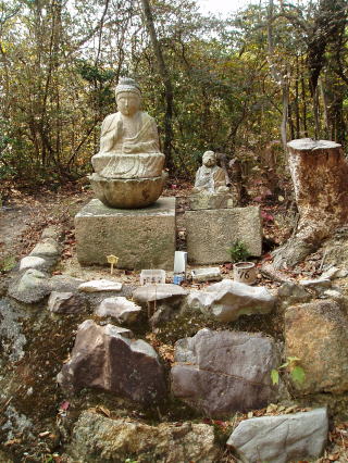| 第八十二番 根香寺 (ねごろじ) 金剛界曼荼羅の五智如来は、大日(中心)・阿閃(東)・宝生(南)・阿弥陀(西)・不空成就(北)である。この五仏を感得した弘法大師は、この地が密教にふさわしいとして山々に青峯、黄峯、赤峯、白峯、黒峯と命名した。曼荼羅の文献によれば、色と仏には密接な関係があり、青は不空成就、黄は宝生、赤は阿弥陀、白は大日、黒は阿閃に対応する。 また、五つの峯は五色台と総称され、根香寺は青峯山、白峯寺はその名の通り白峯山にある。 本尊:千手観世音菩薩 詠歌 宵の間のたえ降る霜の消えぬれば あとこそ鐘の勤行のこえ 注 この祠には、神呪寺の第八十三番の表示があるが、第八十二番の誤りと思われる。 神呪寺の第八十二番の表示のある場所は、弘法大師の石仏が二体安置されているのみであり、本尊がない。 また、第八十三番は自動車道を北に渡ったところにもあり、これが本当の第八十ニ番である。 |