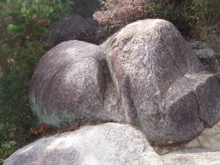 この岩と調査対象との一致は必ずしも明確でない。 この岩の背後には亀の甲羅に似た平たい岩がある。 |