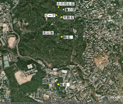 | 図1 北山・越木岩神社近傍のGoogle Earth衛星写真 陽石は太陽石から約200m南に位置する |