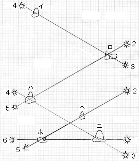 <巨石の名称> イ:火の用心石 ロ:亀の頭 ハ:ピーク ニ:太陽石 ホ:方位盤石 ヘ:雛の冠 <日の出・日の入り線> 1:春分・秋分の日の出 2:夏至の日の出 3:冬至の日の出 4:夏至の日の入り 5:冬至の日の入り 6:春分・秋分の日の入り |