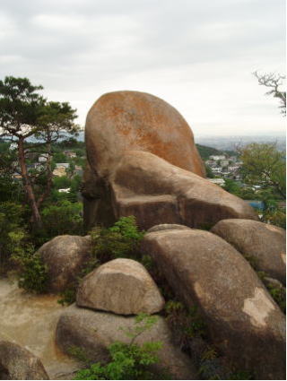 甑岩は越木岩神社のイワクラで、その大きさは高さ10m・周囲約40mである。 摂津名所図会に「甑岩神祠(やしろ)は越木岩村にあり祭神巨岩にして 倚疊(きちょう)甑の如し、此地の生土神(うぶすながみ)とす」とある。 酒米を蒸す時に使う「甑」という道具に似ていることから 「甑岩」と名づけられている。 また、巨岩の形状が女性自身に似ていることから、 女性を守る神として子授かり・安産のご利益があるとされている。 前掲の陽石と対比して見ればおもしろい。 |