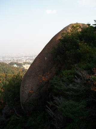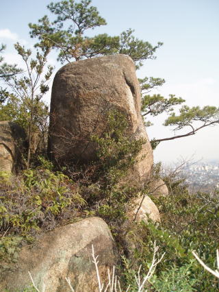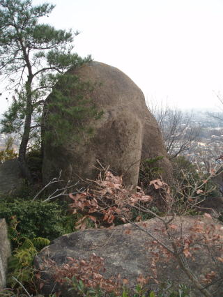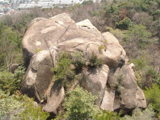 甲山八十八ヶ所の第62番から東を見ると、何やら大きな岩がごろごろしている。 このあたりはすっかり住宅地になってしまったが、古い文献には「目神山の岩場」という文字が出てくる。ここは、おそらく昔の目神山ボルダー群の名残であると考えられる。 |