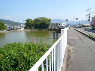 図29の赤線のルートに従って、箸墓古墳の南側を歩いてから、 国道169号線沿いに九日神社へ向かう。 図30の池の向こうのこんもりした森が九日神社。池の手前には纏向川が流れている。 国道169号線は、近鉄桜井駅に向かうバス道となっており、バス停の数も多い。 詳細は「2三輪山の磐座めぐり」の末尾を参照。 |