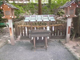 山の辺の道を横切る狭井川を渡り、檜原神社に向かって少し歩くと山側に小さな神社がある。 それが貴船社で、祠の右手(南側)の草むらのなかに写真のような木枠で囲まれた辺津磐座と勘違いしそうな小さな石がひっそりと眠っている。 貴船社の鎮座を調べてみると、「大和国三輪神社之図」(天理大学図書館吉田文庫所蔵)の古絵図には貴船社の記載がないことから、貴船社は宝永年間(1704〜1710)以前には存在してなかったことがわかる。また現在の貴船社の前身は、三輪山大黒谷の「百目石」(文献1B)とよばれる磐座とされる。(文献6) さらに、大神神社の卯神事に行われる貴船神に関しても、正東と艮(東北)に向かって礼拝していること(文献7@)から上記の石は方角的にも一致しない。 これらのことから、この石が辺津磐座でないことがわかる。 |