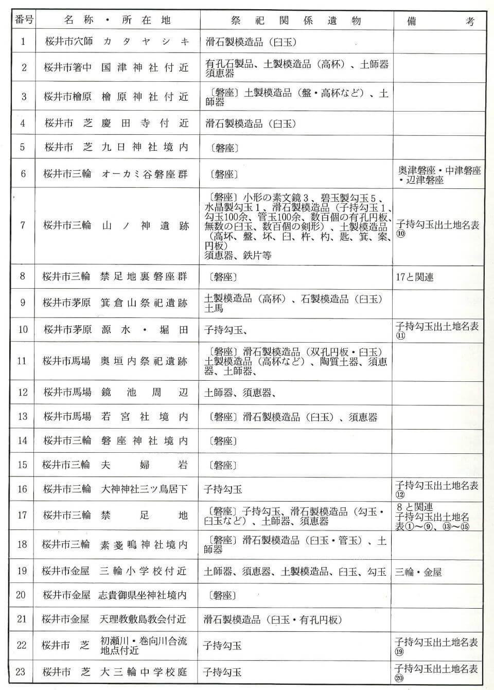 表1 三輪山麓の祭祀遺跡と遺物の一覧表(文献3A)