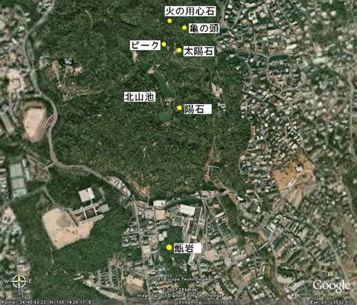 図1A 北山・越木岩神社近傍のGoogle Earth衛星写真