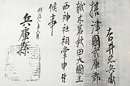 内容は、神社南隣の西平町の戸長(こちょう)である吉井忠兵衛に「摂津国武庫郡越木岩新田大国主西神社祠掌申付候事」とある。