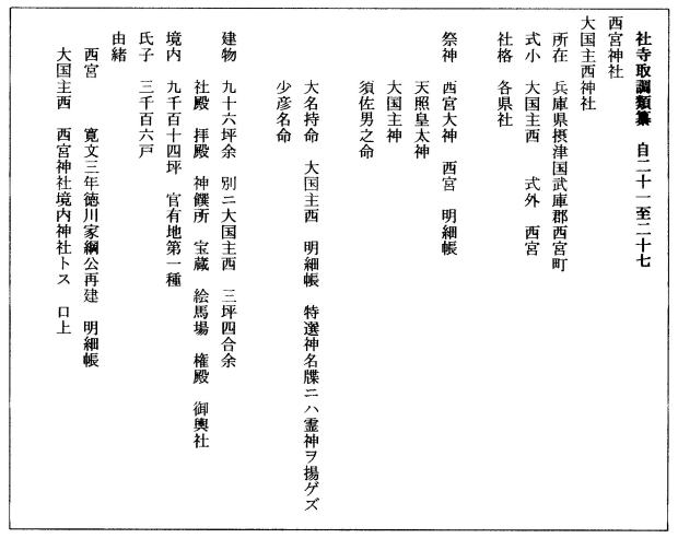 西宮神社は式外。大国主西神社は式内であるが、由緒は口上とあるのみで明らかではない。