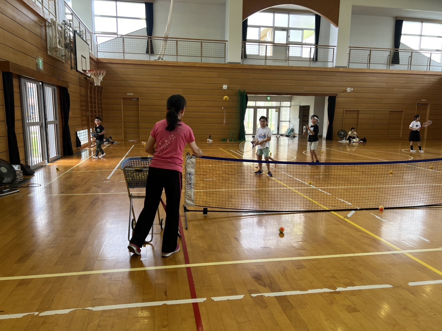 ショートテニス教室の様子です。低学年はスポンジボールで、高学年は少し硬めのボールを使ってレッスンをしています。