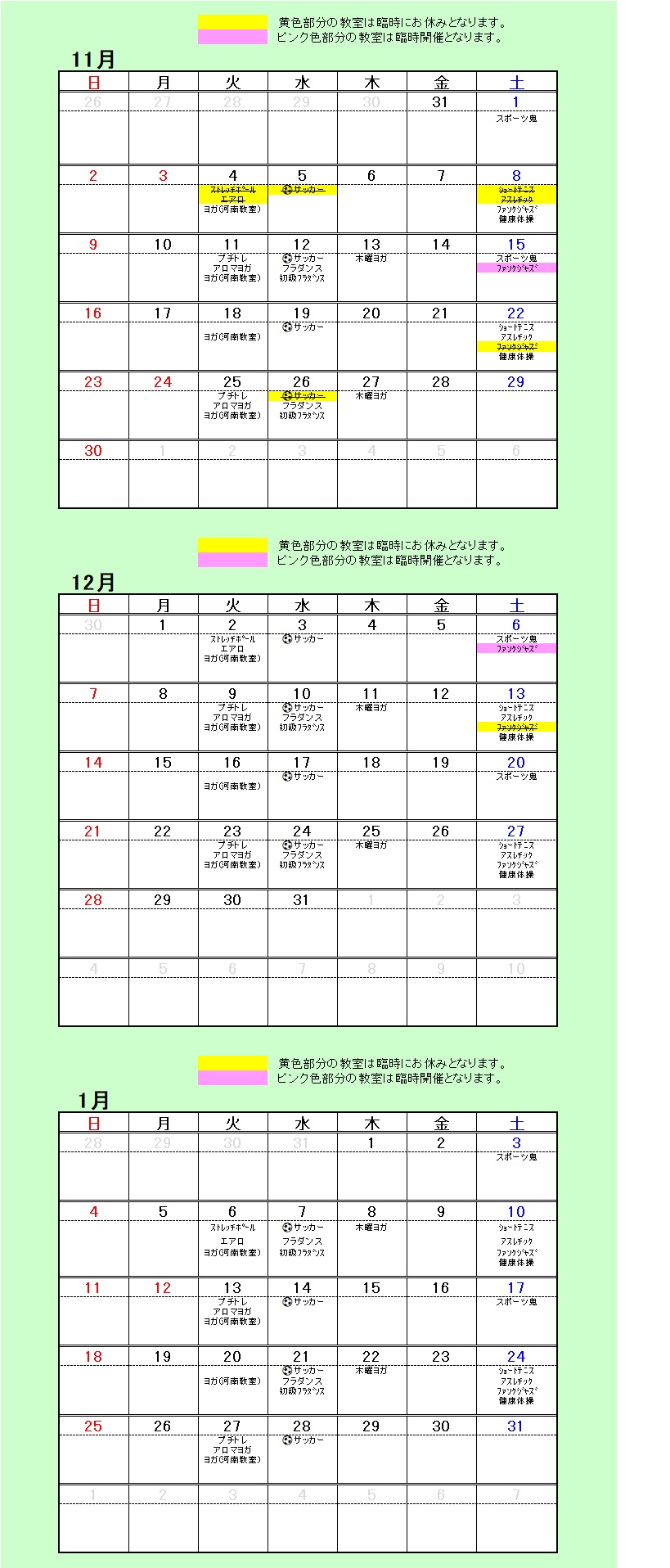 2025年11月~2026年1月のスケジュールは以下となります。スポーツ鬼ごっことアスレチック教室の詳細は別ページに掲載しています