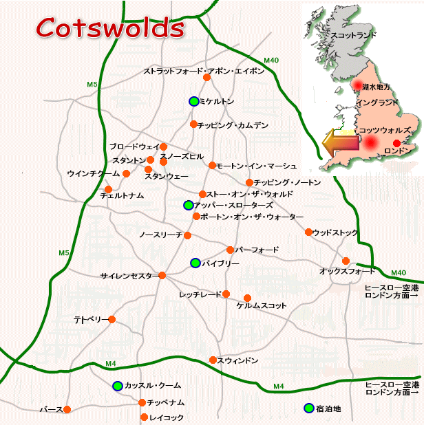 | イギリス・ロンドンの約200Km西、車で2時間弱のところに「英国人の心のふるさと」と言われる、美しい緑あふれるコッツウォルズの田園風景が広がっている。その間にひっそりとたたずむ多くの村々は、地元産出の蜂蜜色(ハニーカラー)の石灰岩(ライムストーン)で造られた美しい家々が立ち並び、その伝統の建築様式は、古き良き英国のたたずまいを残し、まるで中世の時代に迷い込んだような錯覚にとらわれる。 コッツウォルズのコッツ(cots)は古英語で羊,ウォルズ(wolds)は丘を指す言葉らしく,文字通り古くから羊毛産業が盛んな土地だった。しかし,18世紀に起こった産業革命も,この地方で石炭が産出されなかったことから鉄道が敷設されず,したがって,工業化からも取り残される形になったのが幸いして、コッツウォルズの美しい自然と古い町並みが、そのまま現在まで保存されてきた。 コッツウォルズは北のストラットフォード・アポン・エイボンから南はバース、東はオックスフォードから西はチェルトナム辺りまでの丘陵地帯を云い、面積は東京都ぐらいの大きさである。 そのコッツウォルズには約145もの町村があり、その中には今年3月にNHKで「世界一美しい村」と紹介されたチッピング・カムデン、その前年のNHKBSの番組「世界悠々・素晴らしき田園」で紹介されたスローターズ、ウイリアム・モリスが「英国で一番美しい村」と賞賛したバイブリー、骨董品の街ストー・オン・ザ・ウォルド、「コッツウォルズのベニス」と言われるボートン・オン・ザ・ウォーター、「英国で最も古い町並みコンテスト」で幾度も賞を得ているカッスル・クーム、ウィリアム・モリスの「アーツ・アンド・クラフツ運動」の聖地・ケルムスコット、ブレナム宮殿 ( 世界遺産)のあるウッドストック等々多くの美しい小村が点在している。 これらの地域は交通の便が悪く車で回るのが一番だ。今回、レンタカーでこのコッツウォルズ地方だけを目標に日程にもドライブにも余裕をもって、また毎日アフタヌーン・ティーを楽しむことを予定して回ってきた。この地方に特別有名な建築物やモニユメントがある訳でなし、また湖水地方のように多くの美しい湖があって国立公園に指定されてるわけでもなし、あるのは一面緑の丘陵地帯に、のんびりと草を食む羊の群れや、清らかな小川に白鳥やマスが泳ぎ、咲き乱れる花々やガーデニングに囲まれた蜂蜜色の古い家が立ち並ぶだけだが、その美しい田園風景を見ているだけで、心和み癒された気持ちになる。 |