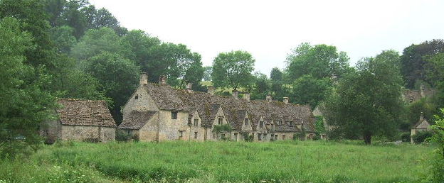 | 午前6時前起床、前夜から激しく降っていた雨もいつの間にか止んでいる。 早速、バイブリー村の散策に出かける。朝早いので、まだ観光バスも来ておらず静かだ、スワン・ホテル前の道をコルン川に沿って南へ歩く。 スワン・ホテル前の清らかなコルン川には、沢山のマスが群れ、川面にはホテルの名前になっているスワン(白鳥)や鴨が泳いでいる。 歩き出して、すぐに右手先にアーリントン・ローの集落が見えるが、そのまま歩くと、教会がありその横を行けばマナーハウスの美しいバイブリーコートホテルの庭に出る。ところが前夜の雨で、水溜りが出来ていたり、草花や樹木もビショビショ、靴も濡れてしまって途中で引き返してしまった。 その先のフットパスをのんびり歩いてぐるっと村を回ってくる予定だったのに残念だ。 |