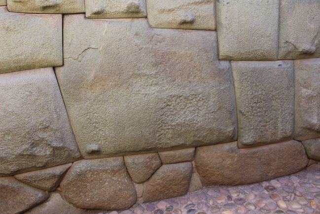 | アルマス広場の周りには、この広場の様子を眺められるように沢山のレストランやカフェ、お土産店などが並んでいる。その中のカテドラルや教会を正面に眺める2階のレストランで肉料理の昼食。食事中にフォルクローレを演奏する二人組が、ペルーの代表的な楽曲である“コンドルは飛んでいく”を演奏していたが、やはり本場の高地で聞くこの曲は、ピッタリな雰囲気を漂わせていた。 昼食後、広場の周りをぶらぶら歩いてインティ・ライミの祭りのパレードを見学、そしてカテドラル(大聖堂)裏手の石畳を少し歩いて、クスコ市街でも有数の観光スポットとなっている「12角の石」の見学に、この石垣こそがインカ帝国時代の建築技術の高さの証拠となっているからである。インカ特有の石組みは、よく見ると、石と石とが精巧に組み合わされ、その隙間はカミソリの刃も通さないといわれるほど精密に造られている。インカ帝国時代の石工の高い技術力と知識には感動を覚える。 |