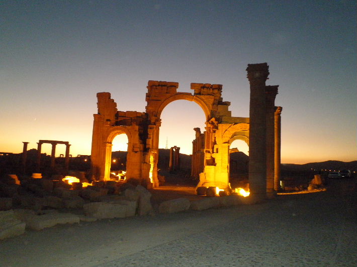 | パルミラへは夕暮れ時に到着、ホテルへは直行せずそのままライトアップされたアラブ城砦へ、頂上には観光バスがUターン出来る場所はないとかで、細い急坂をバックのまま登っていったがその運転技術は見事だ。アラブ城砦は小高い岩山に17世紀に造られた城砦で頂上から見るパルミラ遺跡と砂漠に沈む夕陽が印象的だということだったが、到着が少し遅かったのか夕陽は沈み、風は吹き荒れ、ライトアップされたパルミラ遺跡がボンヤリ見えるだけだった。 だが空には星が輝き、三日月はクッキリ光り、その下にはパルミラ遺跡が広がりとなかなか絵になるような風景でここまで来た価値は充分にあると思った。この後ホテルへ。 |