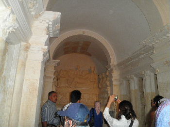 | パルミラ博物館はパルミラの遺跡から出土した碑文、レリーフ、神々の大理石像、青銅の装飾品やベル神殿の復元模型などが展示され、また入口にはアラート神殿から出土した断片を復元した巨大なライオン像も展示されている。この博物館の展示品や復元模型を見てまず遺跡の全体像をつかみ、その後に遺跡を見学する方が理解が早い。 パルミラ遺跡の西に広がる渓谷は“墓の谷”と呼ばれ、色々な形をした墓が並んでいる。 その中でもエラベール塔墓は最大のもので室内は美しく装飾され保存状態も良い。1世紀に造られた4階建て塔型の墓で200人の遺体を収容出来るとか、金持ちエラベール家の一族郎党が入っている。 次は2世紀に造られた3人兄弟の墓へ、この墓はエラベール塔墓と違って当時主流だった地下墓室、美しい壁画やフレスコ画や彫刻で飾られている。 二つの墓を見学後、いよいよパルミラ遺跡の本丸ベル神殿へ、ベル神殿は紀元32年に建てられたパルミラの主神殿。ベルとは、主の意味でパルミラの主神をさした言葉であると云われる。パルミラ最古にして最大の建築物、なかなか壮観な眺めだ。神殿周辺の回廊や前庭の犠牲祭壇なんかは壊れているが 神殿そのものはかなり綺麗に残っている。外壁や色々なレリーフも結構残っており細かい装飾や壁画も野外のわりによく残されていると思う。 |