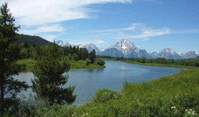 | 西部劇映画「シェーン」の撮影現場であるアンテロープ・フラット・ロードを後にし、ジャクソンホール・ハイウェイを再び北上する。 その間左手には、草原とスネーク・リバーとティトンの山々が見え、しばらくは全米一といわれる美しい雄大な景色がずーーっと続く。空は青く快晴、高原のひんやりと澄み切った空気は美味しく、本当に気持ちの良いドライブコースである。 このジャクソンホール・ハイウェイは海抜2000mぐらい、ティトン山脈の最高峰グランドティトンが4197mなので、標高差は2100mしかない。だから2000m級の山を見ている感じで、それほど高いとは思わないが、それだけに手に届きそうなほど眼前に広がる景色は迫力充分だ。 文才の無い者としては、その迫力充分な美と感動を、どのように表現すれば良いのか?単純にただただ、美しい!素晴らしい!凄いっ!としか表現出来ないのが残念だ。 途中、何ヶ所もビューポイント(展望台)があるので、そのたびに車を停めては写真を撮り、また走り出すということの繰り返し、大自然の美しさに感動しっぱなしだ。 |